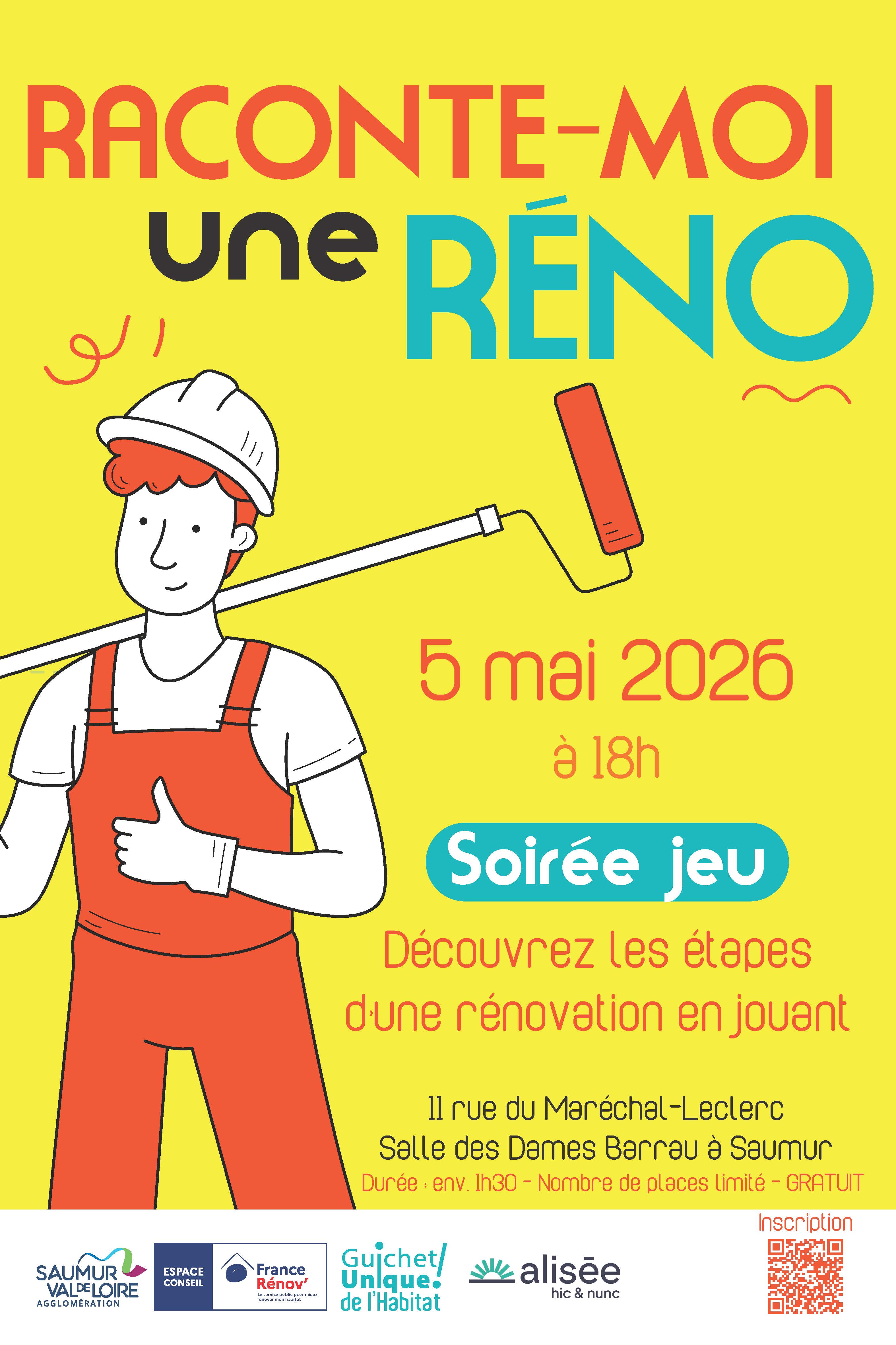 Dans le cadre de la sensibilisation à la rénovation de l’habitat, le Guichet Unique de l’Habitat de la Communauté d’Agglomération Saumur Val de Loire, labellisé Espace France Rénov’, organise, en partenariat avec Alisée, une soirée originale et participative intitulée « Raconte-moi une réno » le mardi 5 mai 2026 à 18h, 11 rue du Maréchal-Leclerc à Saumur.
